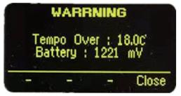 UV METER S1000/S2000/L1500紫外辐射照度计可以自行诊断。如果仪器检测到内部温度超过设定值或电池电压低于设定值(可以通过软件设定内部温度以及电池电压报警值),即显示以下警告画面: